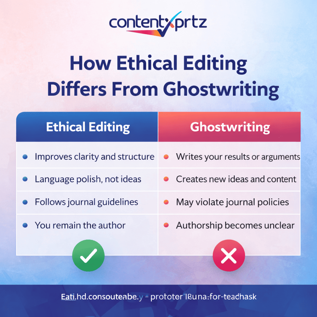 Unlike ethical editing, ghostwriting replaces the researcher’s intellectual contribution.
