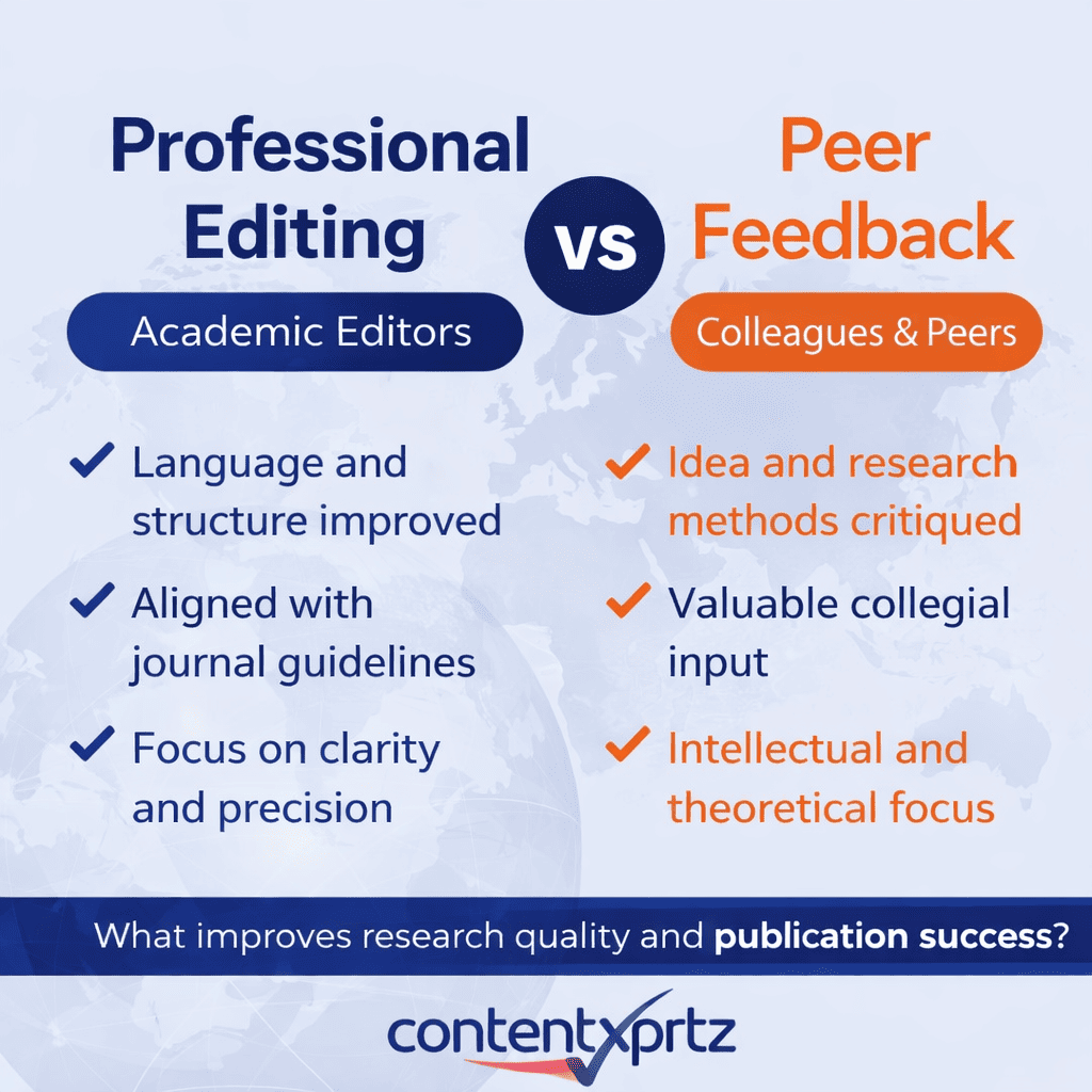 As a global academic support provider established in 2010, ContentXprtz has worked with researchers across more than 110 countries. This perspective informs a balanced and ethical analysis that respects academic autonomy while emphasizing publication readiness. The central question is not whether peer feedback or professional editing is superior in all cases. Instead, the goal is to clarify when each approach is appropriate and how they can be strategically combined to maximize manuscript quality and publication success.